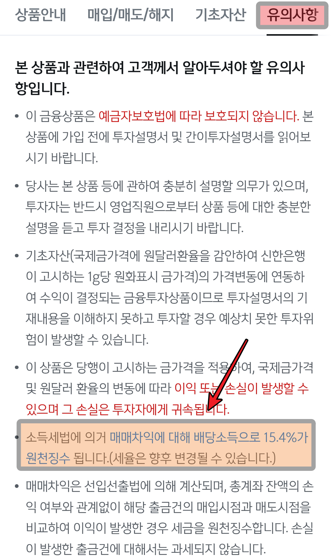 투자를 이어가며 수익이 쌓이자, 혹시 모를 상황에 대비해 금을 팔 때의 세금을 알아보게 되었습니다. 아니 근데... 금통장에서 얻은 매매차익에 대해 15.4%의 배당소득세가 부과가 되더라구요. 유의사항에 딱 나와있었는데 이걸 간과했어요!!!